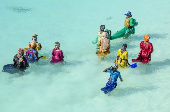 Mujeres locales pescando en las playas de Zanzíbar