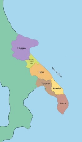 Ubicada en el sudeste de Italia, formando el famoso «tacón de la bota», Puglia está compuesta de varias provincias que ofrecen una gran variedad de paisajes, culturas y tradiciones que convierten a Puglia en una región fascinante para explorar. Las provincias son desde el norte hacia el sur: