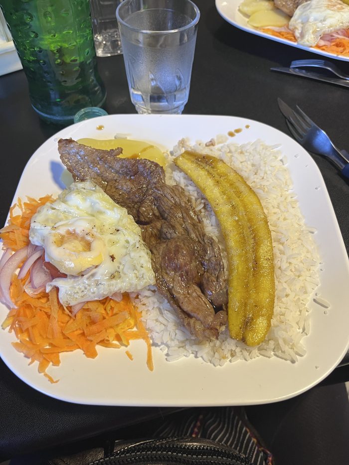 1.5 eur fue lo que pagamos por este plato de carne al cambio en Potosi, en un restaurante muy local