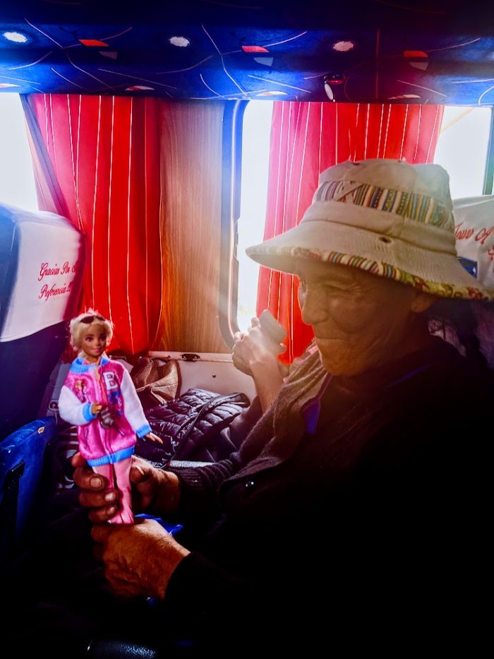 La muñeca Barbiegirl hizo un montón de amigas cholitas en el trayecto de Sucre a Potosí. Foto de Barbiegirl Travels Arts